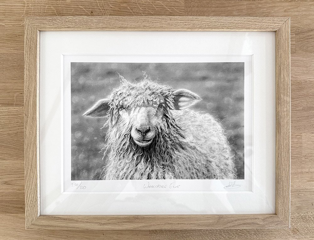 Open edition prints (dog prints) come mounted in the same conservation quality ‘hayseed’ mount board and framed in an oak frame. The frame has a 20mm face and a 15mm depth and come with a strut back so they can hang or stand.