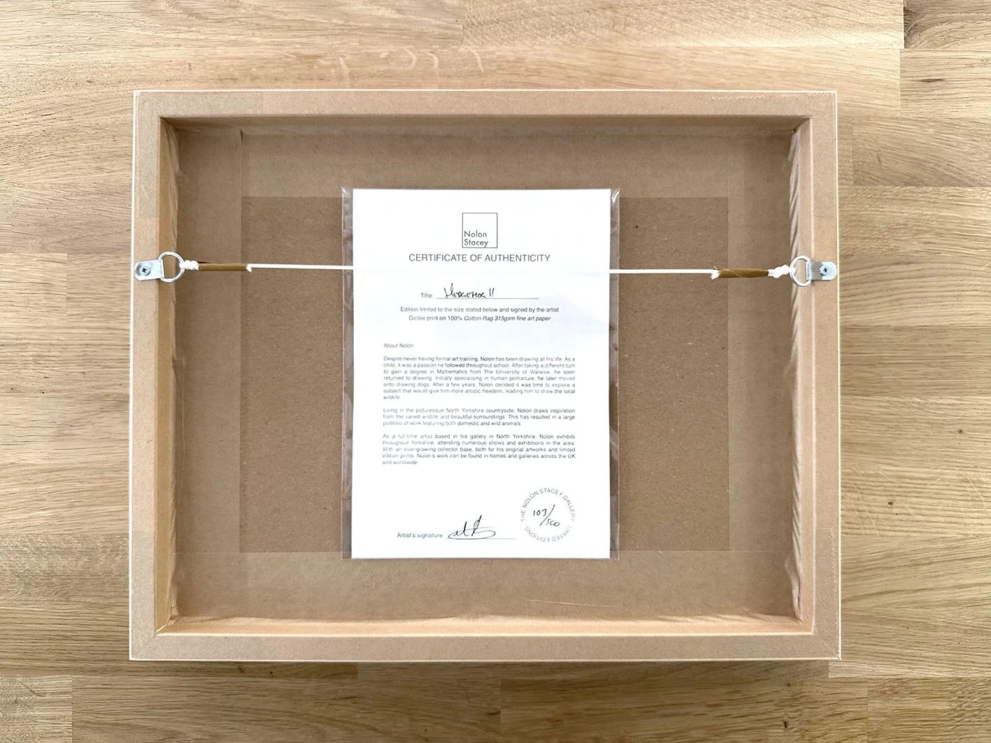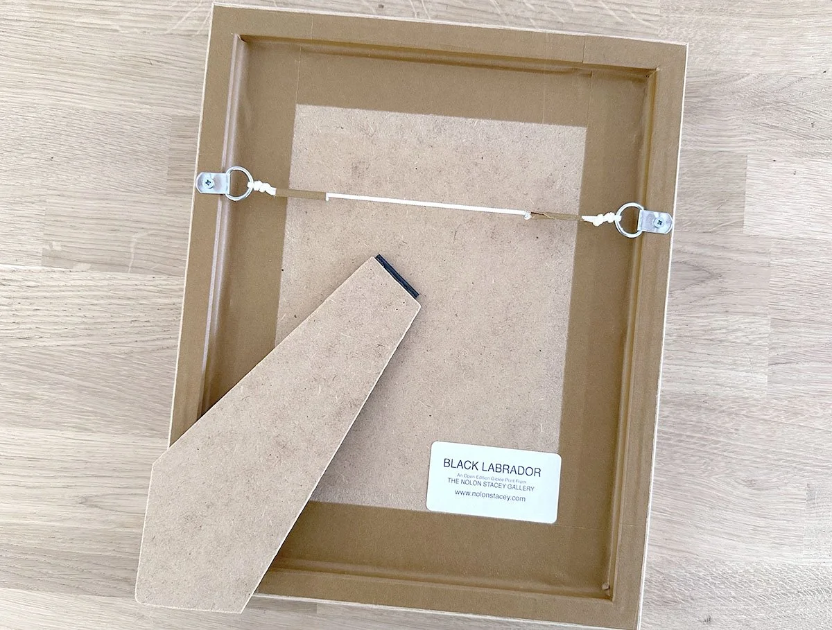 We pride ourselves on finishing the back of the frame to the same high standard as the front, even though it’s rarely seen. All frames arrive ready to hang, fitted with sturdy D‑rings and quality picture cord. The backs are carefully sealed with Kraft framing tape to keep dust and tiny critters out. The Certificate of Authenticity is also securely attached to the back of each frame for your peace of mind.